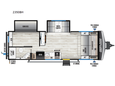 Sleeps 5 Slides 2 Length 28 ft 8 in Ext Width 8 ft Ext Height 10 ft 10 in Int Height 6 ft 9 in Hitch Weight 700 lbs GVWR 7600 lbs Dry Weight 6153 lbs Cargo Capacity 1447 lbs Fresh Water Capacity 40 gals Grey Water Capacity 60 gals Black Water Capacity 30 gals Furnace BTU 35000 btu Number Of Bunks 2 Available Beds Murphy Queen Refrigerator Type 12V Refrigerator Size 10.7 cu ft Cooktop Burners 2 Number of Awnings 1 Water Heater Type On Demand Tankless Awning Info 18' Power w/ Adjustable Legs Axle Count 1 Shower Type Standard Similar Travel Trailer Floorplans