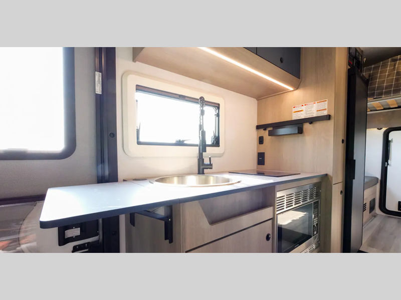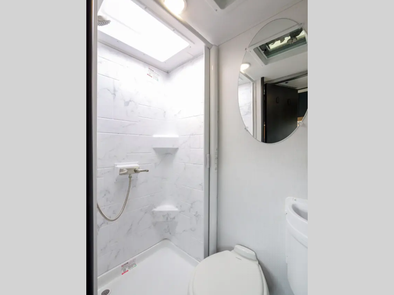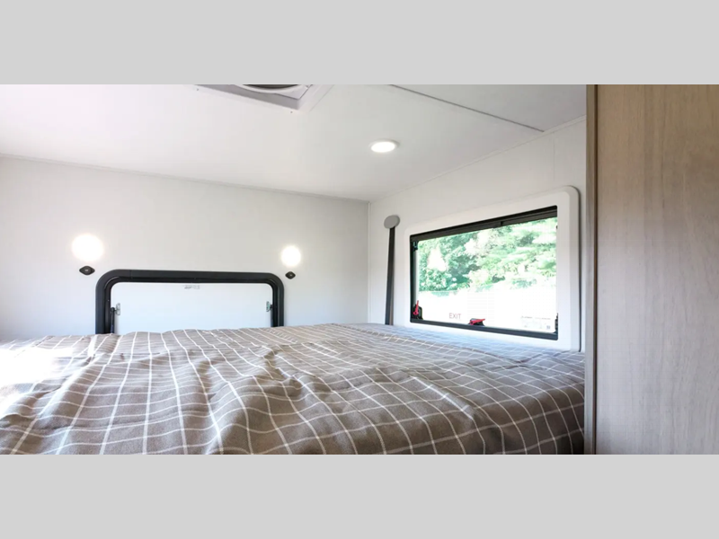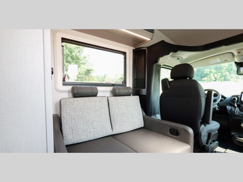 Each model is built with 2" aluminum framed laminated sidewalls, block foam insulation, a laminated fiberglass roof, and tinted acrylic dual pane windows for added protection against the elements. You will also appreciate the power awning with LED lights outside, along with a power entry step and LP quick connect if you plan to bring along your portable grill. The interior is inviting with its blackout shades, soft touch self-closing drawer guides, plus swivel captain's seats that can be turned around once you've parked so you can visit with family.