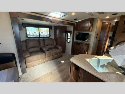 Camping trips are made complete when you have this travel trailer in tow. The rear mountain dinette provides a place to enjoy meals together, and the sleeper sofa slide out is close to the entertainment center for easy viewing of your movies. And if you're not needing the extra sleeping space, you can choose the optional residential sofa with built-in recliners! The chef of your group can prepare home-cooked meals in the kitchen, especially with a flip-up counter for more space. There is also a pantry, sunken range, 10 cu. ft. 12V refrigerator, plus a high-rise pull out faucet for easy clean up. The full bath is towards the front of the unit where you'll find the private bedroom, complete with a queen bed and plenty of storage space for clothes, shoes, and more!