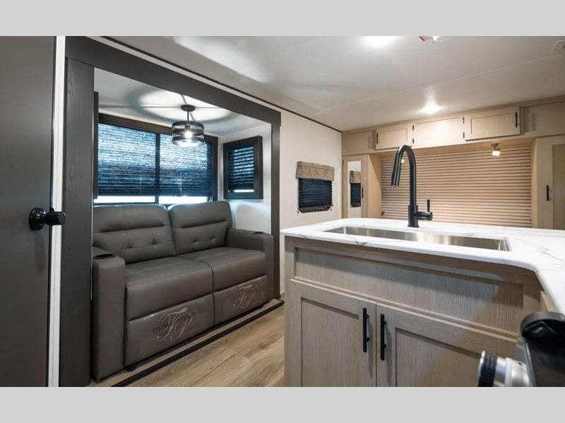 Each is constructed of an aluminum exterior skin, 2x2 wood studs 16" on center or less, fiberglass insulation in all walls, floor and roof, plus Tufflex PVC roof material. The Camping with Ease Package comes a tankless water heater, a 200W solar panel, a Bluetooth portable speaker to listen to your favorite tunes. The Step-Up Package is also accommodating with its power tongue jack, flip-up storage rack, enclosed underbelly, and more!