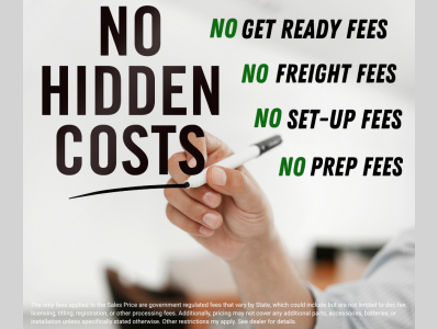 *Sales prices advertised do not include taxes, title and licensing and documentary service fees. Advertised price is available only with dealer arranged financing. Cash or outside financing may result in a higher price. Prices are subject to change without prior notice. Additionally, pricing may not cover any additional parts, accessories, or installation unless specifically stated otherwise. All applicable offers are included in sale prices. For further information, please consult with the dealer.